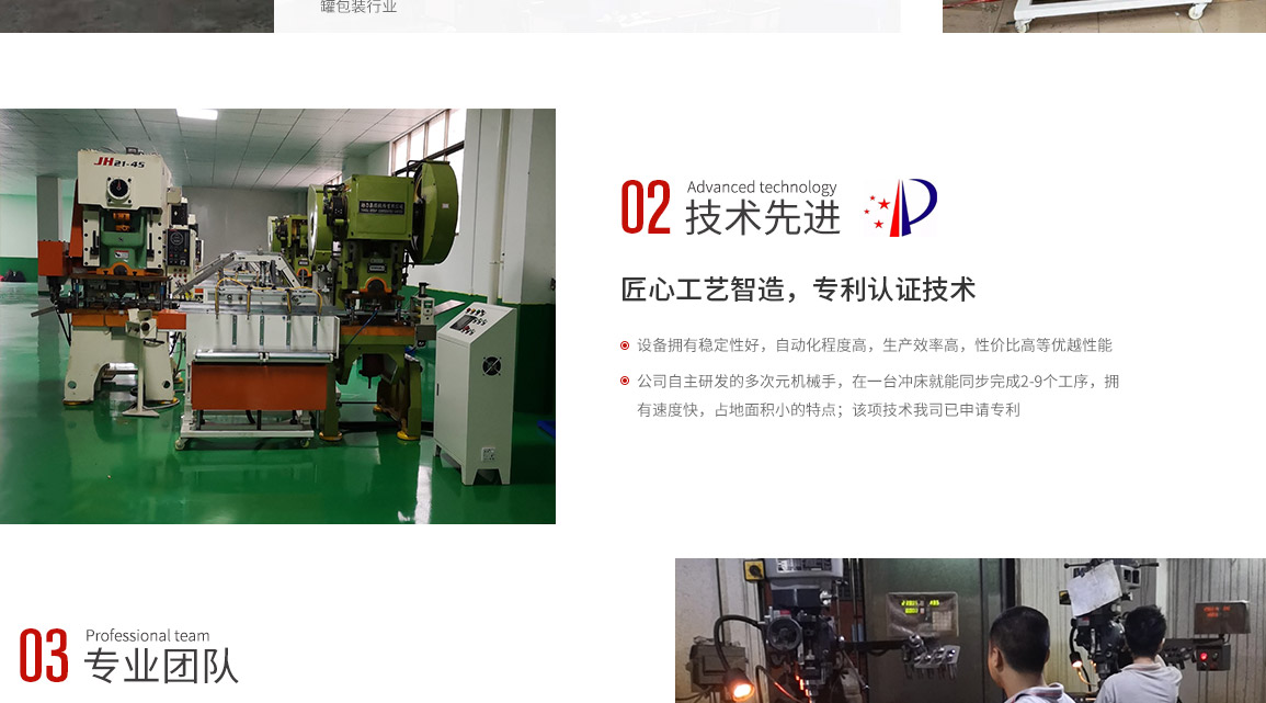 東莞市勝賢機械設備有限公司,是一家專業(yè)從事金屬制罐包裝行業(yè)的整套自動化設備和模具開發(fā)、制造與銷售的公司,擁有成熟的技術和創(chuàng)新開發(fā)能力。我們擁有有一批多年從事設計、研究開發(fā)的工程師,和設備、模具制作的技術人才。不斷推進制罐行業(yè)向高效、環(huán)保、節(jié)能、操作簡易化的方向發(fā)展。 公司主要產品:多次元機械手設備生產:含片盒蓋/底自動生產線,煙盒蓋/底自動生產線,醫(yī)藥盒蓋/底自動生產線,茶葉罐蓋圈/酒罐蓋圈自動生產線,酒罐蓋自動生產線、茶葉罐拍底自動生產線等等。 罐身自動扣骨機生產:茶葉罐/酒罐/化妝品罐/內衣罐等等. 其中多次元機械手專為兩片盒的生產和三片罐的蓋、底、蓋圈、拍底蓋等的生產而設計,...